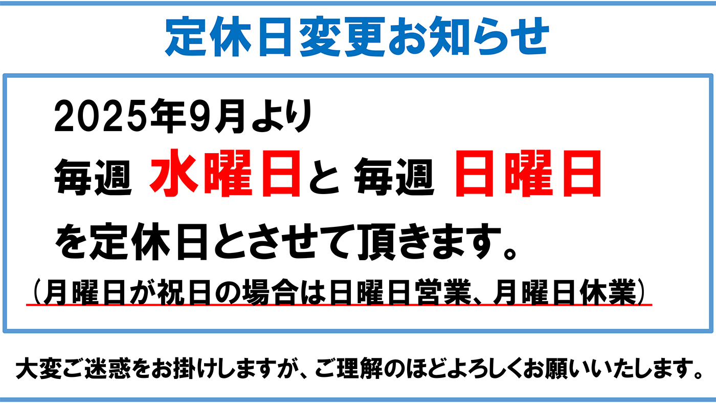 | 【定休日変更のお知らせ】 2025年9月より毎週水曜日・日曜日を定休日とさせて頂きます。 (月曜日が祝日の場合は日曜日営業、月曜日休業) 大変ご迷惑をお掛けしますが。ご理解のほどよろしくお願いいたします。 |