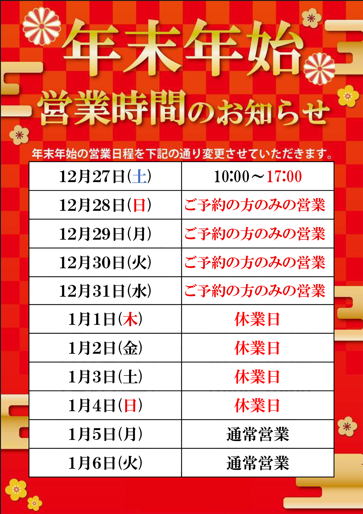 | 謹賀新年 新年明けましておめでとうございます! 本年もどうぞよろしくお願い申し上げます! 1/1は10時から15時まで営業しております! 1/2から1/5まではお正月休み、1/6から通常営業致します。 営業日カレンダー更新しました。 休業日は営業日カレンダーをご確認下さい。 |